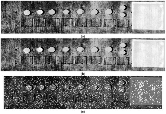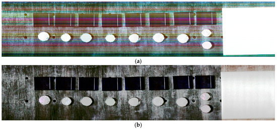 Acceptable evaluation results with respect to succeeding application of the approaches proposed in [14,16] are achieved using n = 3. The destriping is usually not necessary for this HySPEX system. However, uncorrelated offset striping may occasionally appear, which may be reduced using the offset destriping approach of [13]. This results in the computation of the destriped . These rare striping artefacts may be caused, e.g., cooling disequilibrium that is thermally induced by proximal illumination source. The difference between not corrected and perfectly corrected radiometry are demonstrated in Figure 5.