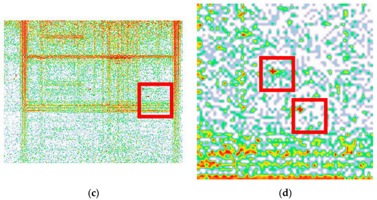 (a) Along track SWIR average ; (b) zoom of a middle right area of (a); (c) Anomaly map and (d) zoom of (c) in the same region as in (b)—both erroneous detectors at x = 249, = 1699.84 nm and x = 260, = 1783.87 nm where detected as ‘anormal’ and interpolated.