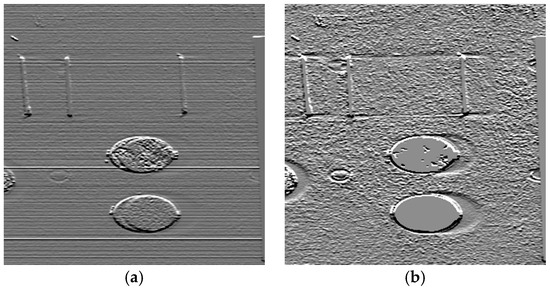 where is the high pass result, is the along track average, is the convolution operator in the spatial domain and is the two-dimensional boxcar filter of size n by n. This high pass result is now considered as anomaly map that contains all gradients. Assuming that object corners and object edges don’t have the same extent as the number of rows or lines (y) they resemble smaller gradients compared to erroneous pixels that represent contiguous, strong gradients. Numerous approaches can be applied to separate object related gradients from erroneous pixel gradients. This work uses a Laplacian approach to amplify the gradients of the high pass along track average as shown in the following equation: