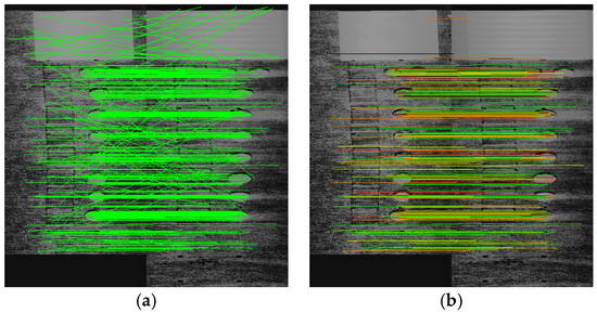 All the resultant tie points are pairwise assigned using multiple processing sub steps. First, the Euclidean distance between the descriptors of all tie points of VNIRref and all tie points of SWIRref is computed and evaluated. Potential pairs within all combinations are found by evaluating the ratio of the smallest and the second smallest distance. If the ratio is smaller than a threshold, then the pair is assumed to be valid. We used 0.7 as the nearest neighbour threshold as recommended in [20]. Mismatches still remain (compare Figure 7a), although the previous step efficiently identified tie point pairs. Now, all angles between the y-axis and the tie point pair vector are evaluated. A tie point pair is excluded if the absolute difference between any angle and the mean angle differs more than 50% (robust upper two quartiles), related to the mean absolute difference between all angles and the mean angle. This constraint utilizes the fact that the coarse shifting of step 2.1 already suppressed the impact of the y-axis boresight, i.e., all angles should be close to 90° due to the sensor geometry. The next step re-evaluates all tie point pairs using RANSAC (the here proposed multi step outlier filtering is used to stabilize the homography solution as proposed in [22]). It can be considered as an iterative, random testing of small sets of tie point pairs for minimizing the point error of remaining tie point pairs if the currently tested polynomial model is applied. In our work, we selected a point error of 1 Pixel as stopping criterion for 1000 iterations with at least 10 points per random test set. If the point error is lower than some threshold (we used 1 pixel) the best polynomial model of RANSAC is applied on VNIRref and RANSAC is applied again with all pairs having a point error lower than the threshold. This two-step RANSAC approach efficiently filters mismatches and the average point error is used to evaluate the performance of the assessed geometric model in relation to some threshold (again 1 pixel). The multi-step outlier removal significantly improves the least squares solution of the polynomial warping model between VNIR and SWIR and is a necessary step before the successive hyperfine warping (compare Figure 7a with Figure 7b. After this step is retrieved, which can be considered as fine co-registered radiance stack of VNIR and SWIR.