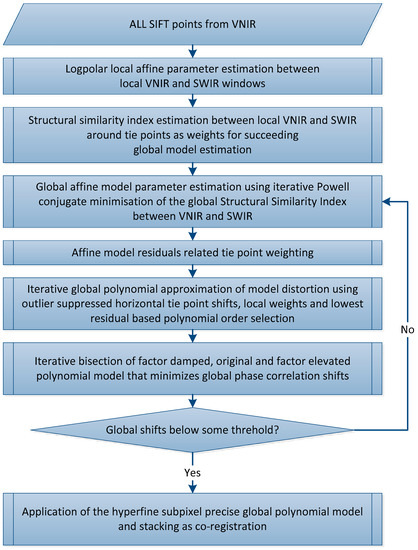 In a next step the first global affine parameter estimation will be conducted using all local affine parameters, the corresponding weights and an iterative Powell conjugate minimisation [27]. The empirical standard deviations of graduated observations (a posteriori residuals of the local affine parameters) are the weights for the succeeding global polynomial model approximation that is used to model high order distortions that are not covered by affine models. The best model is selected by evaluating the empirical standard deviation for different polynomial orders during polynomial modelling. The polynomial model that performs best is selected for succeeding fine adaption of the polynomials. For this global factors higher than 1, equal to 1 and lower than one are selected as starting scaling factors of bisectional polynomial modelling. The same technique is used for keystone assessment as proposed in [23] and iteratively improves global polynomial modelling. This is necessary for high order polynomials that tend to overcompensate data trends if outliers are not fully excluded in the polynomial modelling process. Each iteration of the bisection automatically adapts the three scaling factors (upper, middle, lower) with regard to assessed trends of in parallel estimated global shifts [24]. Consequently the model with the lowest remaining shifts is selected as the preliminary co-registration model, if linear and nonlinear distortions are efficiently reduced due to some threshold. If the shifts are above the threshold, then the empirical standard deviations of graduated observations of the models are used as weights for the global affine parameter estimation to iterate again. The final model for co-registration is applied, VNIR and SWIR are spectrally continuously stacked to after all previous steps. The final model consists of all three assessments—coarse, fine and hyperfine, but only one data resampling is applied. All other resampling was only applied temporary.