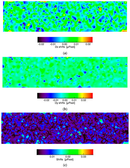 Table 3 indicates that the geometric distortion of the local SIFT windows between VNIR and SWIR is micro-pixel and micro-radiant precise. Additionally, the MSSIM between VNIR and SWIR was improved from 78% to 97%. A comparison of locally shifted windows for the whole image content is not possible, because only high contrast regions are usable. The matching around SIFT points was proven as stable in numerous applications. However, any of the criteria used here for evaluation can be subsequently utilized after the measurement as a quality control step. Therefore, it is also necessary to provide an image content covering an overview of potential distortions. For this, all computed distortions were interpolated using thin plate splines [32] and then visually and subjectively evaluated with regard to potential, dominating gradients. The results for the interpolation are shown in the following Figure 9.