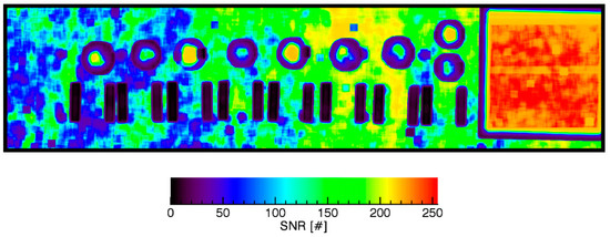 The subjective evaluation of all Figure 9a–d indicates that there aren’t any extensive, dominating gradients in the micro-unit scale. It is concluded that the SIFT algorithm robustly selects high contrast regions that supports the assessments of local distortions. The number of outliers appears to be low. It also appears that the impact of the albedo on the fitting is low as long as the local contrast is high enough. As given by Figure 6c potential SIFT points were found everywhere in the images if the image SNR is high enough. The image SNR is impacted by a variety of factors. The most important factors are the temporal stabilities of the light source and of the sensor sensitivity. As those factors may non-linearly vary the estimation of the image SNR is not trivial and can be considered as an own subject of research. However, we applied a straightforward, simplified approach to retrieve the image SNR similar to the approach proposed by Gao et al. [33]. First, a copy of the image is smoothed using a 9 × 9 boxcar filter (moving average). Then, the local image content of a 16 × 16 pixel moving window is extracted from the smoothed and original image content. The averages of each window of the smoothed image and the standard deviations of each window of the difference between the smoothed and original image are computed. Then, the ratios between the averages and standard deviations are computed. The result is given in Figure 10.