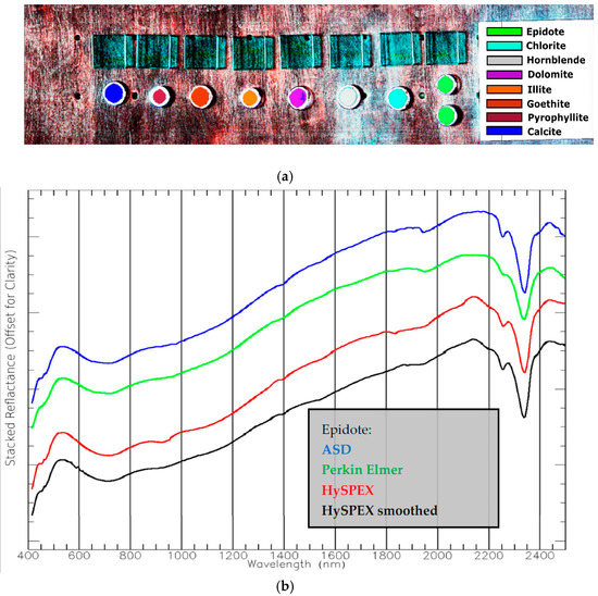 (a) False colour HySPEX image (Red 2210.02 nm, Green 800.295 nm, Blue 651.19 nm) overlain with classification of EnGeoMAP [1], (b) Epidote spectra from different spectrometers—‘HySPEX’ spectrum as spatial average of 10 × 10 pixel spectra, ‘HySPEX smoothed’ Gaussian smoothed spectrum (black).