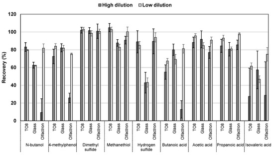 The reduced sulfur compounds had the highest recovery in all cases, reaching 96.4%, 76.4%, and 98.1% in the TO8 olfactometer, the glass olfactometer, and the Olfacton dilution system, respectively. However, dimethyl sulfide was the only compound that was almost completely recovered in all cases. Methanethiol and hydrogen sulfide were subject to the relatively significant losses in the glass olfactometer of approximately 20% and 60%, respectively. This was consistent with previous studies, which found that sulfur compounds (i.e., hydrogen sulfide) undergo losses at the surface of sample materials of glass and stainless steel [23,24,25]. The loss found in this study followed the pattern of reactivity of hydrogen sulfide being the most reactive of the tested sulfur compounds and dimethyl sulfide being a non-protic and relatively non-reactive compound. In relation to hydrogen sulfide, it should be noted that the sensitivity of the measurements was reduced because of the low raw signal of this compound before a humidity correction. This resulted in a relatively higher standard deviation at the plateau of, on average, ±10−15% compared to the other sulfur compounds, which alongside n-butanol, showed a high level of stability in the PTR-MS measurements by the high B-values, little to no tail-off, and stable signals at the concentration maxima (±2−3%).
