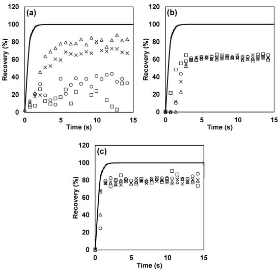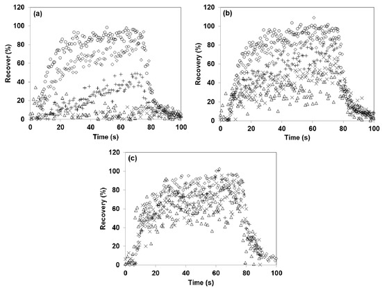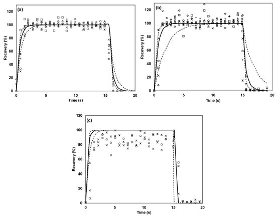 Evolution of recovery of n-butanol in: (a) Olfacton dilution unit, (b) glass olfactometer, and (c) TO8 olfactometer. The solid line (—) indicates the expected recovery on the basis of the fitted PTR-MS model, the dotted line (······) indicates the 95% confidence interval of the model, □ represents a dilution factor of , ○ represents a dilution factor of , × represents a dilution factor of , and ∆ represents a dilution factor of .