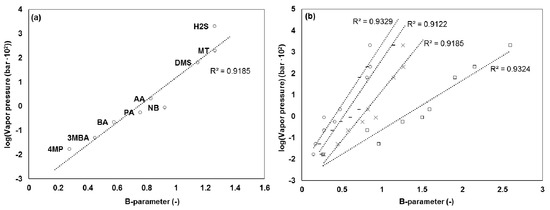 (a) B-values of compounds in TO8 dilution system versus the logarithm of their vapor pressure (4MP = 4-methylphenol, 3MBA = 3-methylbutanoic acid, BA = butanoic acid, PA = propanoic acid, AA = acetic acid, NB = n-butanol, DMS = dimethyl sulfide, MT = methanethiol, and H2S = hydrogen sulfide), (b) B-values of compounds in PTR-MS (□), TO8 olfactometer (×), glass olfactometer (︻), and Olfacton dilution system (○). Data labels are omitted for simplicity but follow the order of Figure 6a.