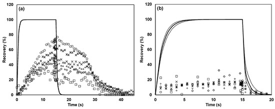 Recovery of (a) n-butanol and (b) butanoic acid in stainless steel tube. The solid line (—) indicates the expected recovery on the basis of the PTR-MS fitted model, the dotted line (······) indicates the 95% confidence interval of the model, □ represents a dilution factor of 3574, ◇ represents a dilution factor of 1958, + represents a dilution factor of 970, × represents a dilution factor of 483, ꁘ represents a dilution factor of 236, and ○ represents a dilution factor of 125.
