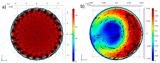 The design of the olfactometers may also play a role in the recovery of odorants. In this study, the olfactometers examined varied greatly in their dimensions. Comparing the delivery lines in the glass olfactometer to those applied in the TO8 olfactometer and the Olfacton dilution system, the cross-sectional area and the specific surface area were approximately 28 and 5 times greater, respectively, in the glass olfactometer. Furthermore, the glass olfactometer was constructed with two 90° bends. The possible influence of flow and transport phenomena on the delivery of odorants to the outlet of the TO8 and glass olfactometers were investigated numerically with Comsol Multiphysics. The Navier–Stokes equations describing the fluid dynamic problem arising when 80 L/min of air enters each of the pipe systems and exits at atmospheric pressure were solved as a stationary problem using the direct Paradiso algorithm. The flow was turbulent with Reynolds numbers of approximately 3000 for the glass olfactometer and 57.000 for the TO8 olfactometer. Therefore, a RANS Spalart–Allmaras model was used to describe the turbulent flow behaviour. Supplemental Figure S4 (in the Supplementary Materials) shows the velocity field at a section through the middle of the glass olfactometer, and stream lines describe the 3D flow through the system. To numerically mimic the overall interaction between the convective flow and individual molecules, massless particles were released at the inlet and tracked through the delivery lines. The adsorptive behavior of the particles was not considered in this model. The result in Figure 9 is a spatial plot of the expected distribution of the molecules, together with the absolute velocity of the flow at the exit.