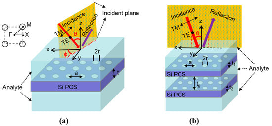 Figure 1a shows the schematic of a single-layer Fano resonance square lattice PCS sensor, where key design parameters are defined as lattice period (a), air hole radius (r), and thicknesses of the Si PCS (t). As shown in Figure 1a, two angles are defined to represent the propagation direction of the incident beam, the incident angle θ (the angle between incident beam and the surface-normal z axis) and the azimuth angle φ (the angle between the positive x-axis and the incident beam projection in the x–y plane). The Si PCS is immersed in symmetric aqueous analyte (RI = 1.33), which also fill the air holes. The refractive index of Si is taken as 3.48. A portion of the incident light gets reflected back and the other portion of light gets transmitted through the PCS, neglecting the absorption in the analyte and the PCS. The second configuration consists of two Si PCS separated with an air gap distance tg, as shown in Figure 1b. The thickness of the top Si PCS is t1 and the bottom Si PCS is t2. The coupled PCS is immersed in analyte with the air hole and air gap filled with analyte.