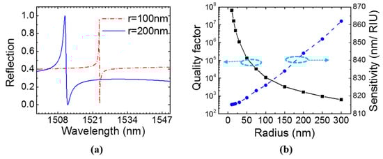Simulation of single-layer PCS with a = 1000 nm and t = 160 nm at surface-normal incidence (θ = 0°). (a) Reflection spectra of PCS with two different hole radiuses. (b) Quality factor and sensitivity of the Fano resonance in PCS with different hole radiuses.