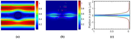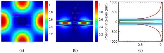The energy distribution ε|E|2 of the field at resonance wavelength was computed to estimate the optical integral f in the analyte region. Figure 3a shows the ε|E|2 distribution at the center of the Si PCS (z = 0) in the x–y plane, which shows almost no field distribution in the hole region. The ε|E|2 distribution at the center of the hole in the y–z plane is shown in Figure 3b. To calculate the amount of field energy in the analyte region, we integrated ε|E|2 in one unit cell along the z axis, which is plotted in Figure 3c. The blue shaded area is the Si PCS region. As analyte exists above and below the PCS, the calculated optical integral f in analyte is 0.733. The sensitivity is estimated to be 839 nm/RIU from Equation (2), which agrees well with the sensitivity of 830 nm/RIU calculated from resonance spectral tracking using S4.