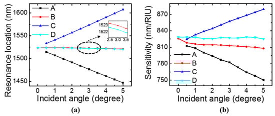 If the incident angle θ of the beam is not strictly zero, the symmetry is broken. At Γ point (k = 0, θ = 0°), square lattice possesses a symmetry group of C4υ. If it moves from Γ point to X point (θ ≠ 0°, φ = 0°), the symmetry group changes to C1h [45]. As shown in the inset of Figure 4a, the mode existing at θ = 0° splits into two modes, B and D. Two new modes A and C emerge in the spectra when θ is non-zero. They are symmetry-protected BIC at θ = 0° because there is a symmetry mismatch between them and the radiation modes [23,33]. Modes A, B, and C can be excited by source with TM polarization, while mode D can be excited by a source with TE polarization. Sensitivity of the four modes are plotted in Figure 4b. Mode A has lower sensitivity at larger angles, while mode C has higher sensitivity at larger angles. Sensitivity for modes B and D remains relatively unchanged in the incident angle range of 0–5°.