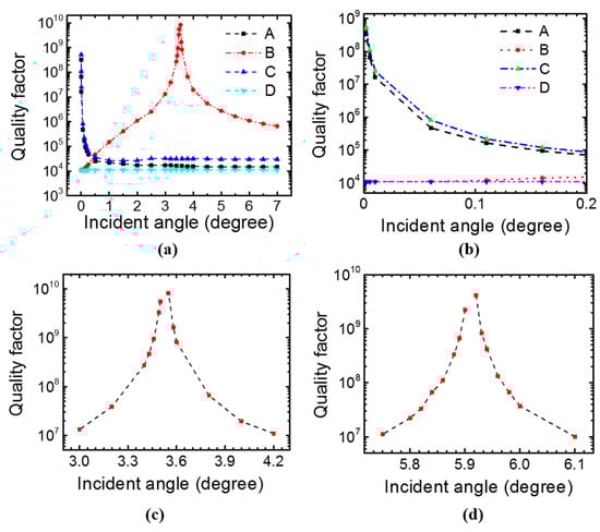 Figure 5a shows the calculated quality factor with Fano fitting of the four modes at φ = 0° from the simulated reflection spectra. Modes B and D have a Q around 104 at θ ≈ 0°, while the singly degenerate modes A and C have infinite Q when θ ≈ 0°. Figure 5b shows a zoom-in view of the Q for the four modes at small incident angles. Modes A and C have Q > 107 in the incident angle range of 0–0.01°. When the azimuth angle φ is not zero, modes A and C occur at slightly different wavelengths in the reflection spectrum, but the quality factors for them are not affected much by the azimuth angle.