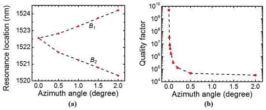 Unlike modes A and C, mode B splits to two modes B1 and B2 when the azimuth angle φ is not zero, as shown in Figure 6a. The quality factor reduces for mode B1 when azimuth angle increases, as indicated in Figure 6b. Mode B2 has lower Q than B1 and it is not discussed here. For mode B1 to achieve Q > 107, the azimuth angle φ needs to be in the range of 0°–0.02°.