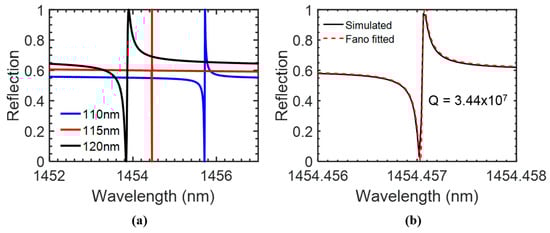 The schematic of the coupled bi-layer PCS is shown in Figure 1b. The coupled bi-layer PCS is immersed in aqueous solution with RI of 1.33. The 2D Si PCS has a square lattice with period a = 1000 nm and a hole radius r = 100 nm. The thickness of top Si PCS t1 and bottom Si PCS t2 are both 80 nm. The gap distance tg affects the mode coupling between the top and bottom PCS [36]. We simulated the bi-layer PCS structure under surface-normal incidence condition with S4 software. The reflection spectra for the bi-layer PCS with gap distances tg of 110, 115, and 120 nm are plotted out in Figure 7a. Fano-fitting of the reflection spectrum for the coupled bi-layer PCS with tg = 115 nm shows a quality factor of 3.44 × 107, as shown in Figure 7b.