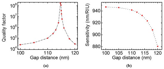 We further studied quality factor of the Fano resonance dependence on the bi-layer gap distance in Figure 8a. The Fabry–Pérot BIC forms at gap distance tg around 114.7 nm. The top and bottom PCS act as a pair of perfect mirrors that trap waves between them. The bound state has an infinite Q and it cannot be observed in the spectrum. When the gap distance is slightly off, the bound state is perturbed, and it can couple to the external radiation mode with extremely high Q. The bulk sensitivity decreases from 950 nm/RIU to 880 nm/RIU when the gap distance increases from 100 nm to 120 nm, as shown in Figure 8b.
