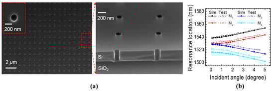 As a proof-of-concept to the theoretical studies, we experimentally demonstrate one single-layer PCS design, which represents the Case S2 (near surface-normal incidence case) discussed in Section 3. We fabricated the single layer PCS on silicon on insulator (SOI) substrate with electron beam lithography (EBL) and dry etching with HBr/Cl2 gases. The top Si device layer thickness is 250 nm and the buried oxide thickness is 3 μm. The top view and cross-sectional view scanning electron microscope (SEM) images are shown in Figure 10a. The device was characterized with the cross-polarization technique as detailed in a previous work [23]. The measured and simulated resonance locations of the four modes at different incident angle from 0.1° to 5° are plotted in Figure 10b. The measured results agree well with the simulation results.