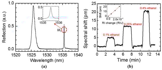 Ethanol/deionized (DI) water mixture with different concentrations (0.1–0.4% volume ratio) were injected into the polydimethylsiloxane (PDMS) microfluidic channel bonded on the device to test the resonance shift of mode M1. The sensorgram of mode M1 with 0.1%, 0.25%, and 0.4% ethanol/DI water mixture are shown in Figure 11b. DI water was used to rinse the PDMS chamber after each test run of ethanol/DI water mixture. In the inset of Figure 11b, the spectral shift of mode M1 is plotted with respect to RI change of the analyte above the PCS surface. The 0.1% ethanol/DI water mixture has a 6 × 10−5 RIU RI change compared to DI water and induced around 5 pm spectral shift, which can be clearly distinguished. The bulk sensitivity is 94 nm/RIU obtained from the linear fitting of the measured results. The sensitivity could be increased by decreasing the PCS thickness and suspending the single layer PCS in the analyte solution so that a larger optical field will interact with the analyte. As discussed in Section 3, the sensitivity for single layer PCS can be as high as 800 nm/RIU with the optimized design.