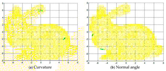 Curvature is an important basis for feature recognition. The value of the curvature reflects the concavo-convex degree of the point cloud surface. The sharp features of the point cloud have a relatively large curvature. On the other hand, the non-feature parts of the point cloud have a relatively small curvature. In this paper, we use the method of [28] to estimate the normal and curvature of the data points by analyzing the covariance of the neighboring points. For the point cloud data set , the neighboring points covariance of the given point is analyzed and the covariance matrix is solved. The eigenvector direction corresponding to the minimum eigenvalue is defined as the normal of the point. Then, according to the surface change of the point in local region, the curvature can be estimated:
