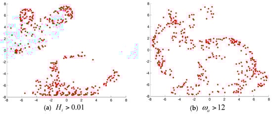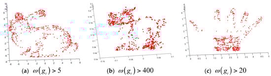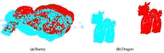 - Select the initial sample points of two point clouds. The selected initial sample points satisfy , where is the feature parameter of point cloud data point , and is the feature parameter threshold. The selection of value should be based on different point cloud data (For example , we selected in Figure 5a).