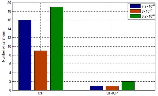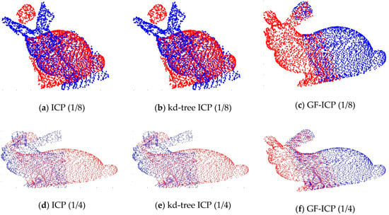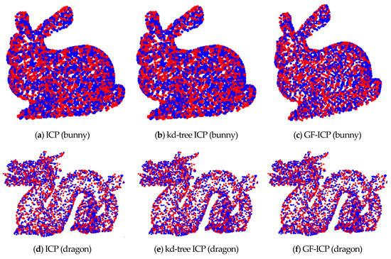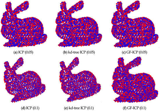 In order to analyze the immunity of the algorithm to noise, we first added different degrees of noise to the point cloud data. Then, the ICP algorithm based on quaternion, the ICP algorithm based on k-d-tree and the algorithm proposed in this paper are used to match the above point cloud data with different degrees of noise. Figure 12 shows two “bunny” point cloud data superimposed by various levels of zero mean additive Gaussian noise. Among them, the first added variance is 0.05 m, and the second one is 0.1 m. Figure 13 shows the matching results of the three ICP algorithms after applying the Figure 5a bunny point cloud position. Among them, the first row shows the point cloud registration results after adding Gaussian noise with the variance of 0.05 m; the second row shows the point cloud registration results after adding Gaussian noise with the variance of 0.1 m. After the registration of the point cloud, when the noise is 0.05 m, the matching error of the ICP algorithm is 28.6418 m and the iteration number is 21, while the matching error of the GF-ICP algorithm is 28.6438 m and the iteration number is 5. When the noise is 0.1 m, the matching error of the ICP algorithm is 89.5296 m and the iteration number is 25, while the matching error of the GF-ICP algorithm is 89.5574 m and the iteration number is 7.
