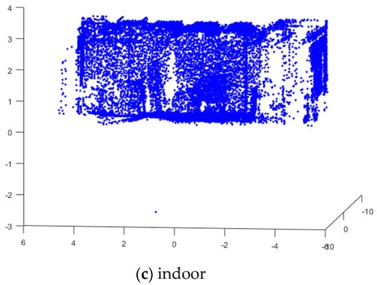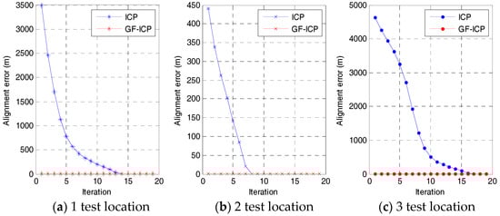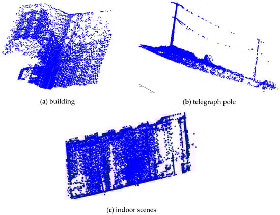 In order to verify the effectiveness of the algorithm in real large-scale point cloud data registration, we tested different point cloud data. Figure 14 shows three sets of point cloud data to be tested. Figure 14a was a building point cloud dataset [32] provided by the CSDN, the point cloud data is 13292 after down-sampling. Figure 14b was an outdoor telegraph pole point cloud dataset [33] provided by the CSDN, the point cloud data is 17223 after down-sampling. Figure 14c was an indoor scenes point cloud dataset provided by the ASL Datasets [34], the point cloud data is 16496 after down-sampling. These three sets of point cloud data are obtained by scanning real objects with different features. We using MATLAB to randomly generate three sets rotation and translation for the point cloud data. Figure 15 shows the registration results. In Figure 15a, the matching error of the GF-ICP algorithm is 0.7629 m; in Figure 15b, the matching error of the GF-ICP algorithm is 0.9473 m; in Figure 15c, the matching error of the GF-ICP algorithm is 0.9071 m. Figure 15 shows the algorithm proposed in this paper achieve better registration results in large-scale real point cloud data.
