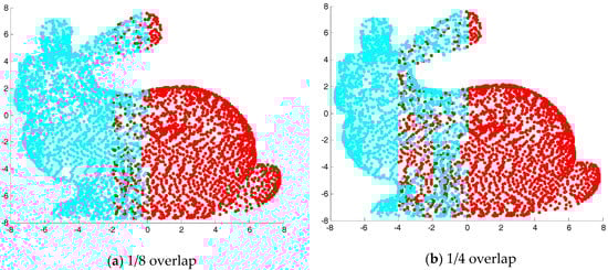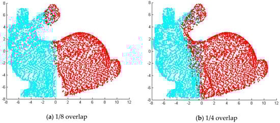 In order to verify the registration effect of the ICP algorithm based on point cloud features, the “bunny” point cloud data are separated from the middle by two sets of overlapping effects, as shown in Figure 9. We used MATLAB to randomly generate a rotation and translation for the second half of the “bunny” point cloud, as shown in Figure 10. Figure 11 shows the registration results of two ICP algorithms and the algorithm proposed in this paper under the same test conditions. It can be seen from the results that the ICP algorithm based on quaternion and the ICP algorithm based on kd-tree are consistent in the registration results, and none of them have been registered. However the algorithm proposed in this paper achieves better registration results in the presence of two different cloud overlap.