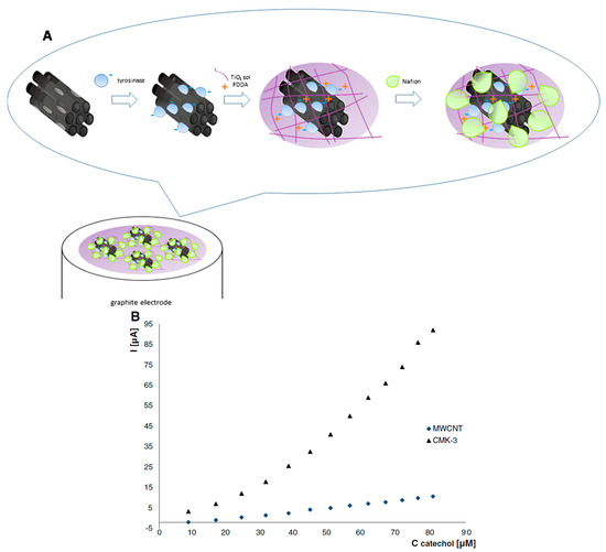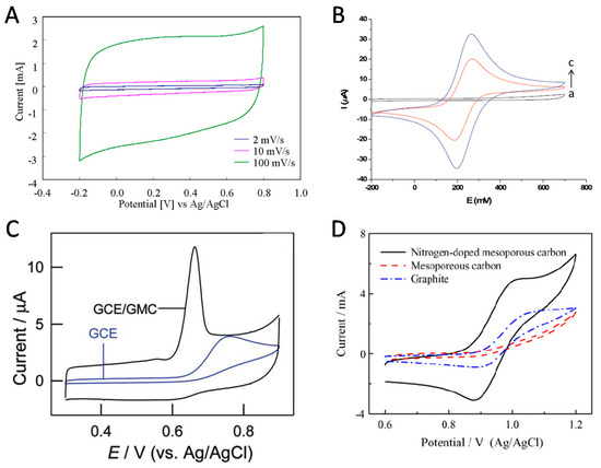 - Series of redox mediators have been adsorbed onto OMC surfaces (Figure 6C), either via π–π stacking, or hydrophobic interactions, or electrostatic attractions, or combinations of these effects. Examples are available for ferrocene-carboxylic acid [112,113], Ru(bpy)32+ [114], metal porphyrins [115,116] and other metal-ligand complexes [117,118], polyoxometalate and related derivatives [24,119], curcumin [120], tetrathiafulvalene [121], metal hexacyanoferrates [122,123,124,125,126]. Non-redox reagents were also immobilized on OMC, such as organic ligands or polymers [127,128,129], as well as ionic liquids [130,131,132] or surfactants [126,133,134]. Due to the electronic conductivity of OMC, the redox-active species can be involved in mediated electrocatalytic schemes in their immobilized form (contrary to non-conducting mesoporous hosts, such as silica-based nanomaterials, for which a certain physical mobility of mediators is necessary to get high sensitivity [135,136], except in case of charge transfer by electron hopping [137,138]).