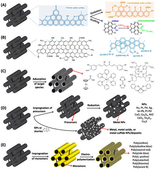 - The simplest way is surface oxidation to generate a high density of oxygen-containing groups (carboxylic acid, phenol, carbonyl, etc.) [105,106] or surface grafting of reactive functions (e.g., amine) [50] (Figure 6A). The success of such reactions is easily monitored by surface analysis (using X-ray Photoelectron Spectroscopy, XPS, for example).