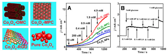 | Glucose | BGMC (KIT-6/sucrose) | - | GOD | GCE/(OMC/GOD + Nafion) | up to 7.49 × 10−3 M | 1.0 × 10−5 M | 30 days (95%) | [226] |