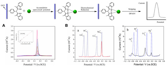 - Preconcentration electroanalysis. Ultrasensitive sensors were designed from OMC electrodes modified with selective recognition hosts such as molecularly imprinted polymers for detection of pharmaceuticals (i.e., dimetridazole [128] and ofloxacin [129]) or anchoring ligands for metal ions determination [174]. Figure 9 illustrates an interesting example for mercuric ions detection after open-circuit preconcentration by complexation to bis(indolyl)methane immobilized onto mesoporous carbon nanofibers and subsequent detection by stripping voltammetry in the nanomolar concentration range (Figure 9A). Interestingly, the sensor was highly selective towards mercury recognition in the presence of other metal ions (Cu2+, Pb2+, Cd2+), especially in comparison to the unmodified OMC electrode for which all species were likely to accumulate (see part a in Figure 9B), but only if the preconcentration step was performed at open-circuit for which the organic ligand inhibits the accumulation of Cu2+, Pb2+ and Cd2+, while promoting the enrichment of Hg2+ species. In case of accumulation under cathodic potential, whatever the electrode used, the four stripping peaks were observed (see part b in Figure 9B), confirming the critical role played by the organic ligand to ensure high selectivity. Nevertheless, accumulation under potential can be applied as long as differentiation between the various species can be made on the basis of their different stripping peak potentials, and this has been notably exploited for the simultaneous detection of Pb2+ and Cd2+ in the picomolar concentration range using OMC modified electrode functionalized with bismuth oxide [172]. In that case, both metal ions and bismuth oxide are reduced in the form of an amalgam in the preconcentration step and square wave anodic stripping voltammetry is applied for detection. The interest of OMC for preconcentration electroanalysis applications is similar as for mesoporous silica-based sensors [191], exhibiting faster mass transport rates in comparison to their non-ordered homologs [192].