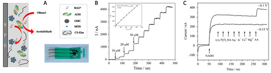 | Ethanol NADH | GMC | Meldola’s Blue | ADH | SPE/(OMC + chitosan + MB + ADH) | 5 × 10−4–1.5 × 10−3 M 1.0 × 10−5–4.1 × 10−4 M | 8.0 × 10−5 M 1.86 × 10−7 M | 40 days (91%) | [212] |