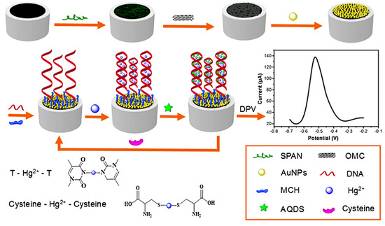 | HgII | OMC | Au NPs | DNA | GCE/PANI/AuNPs/ssDNA | 1 × 10−14–1 × 10−6 M | 6 × 10−16 M | 1 month (85%) | [257] |