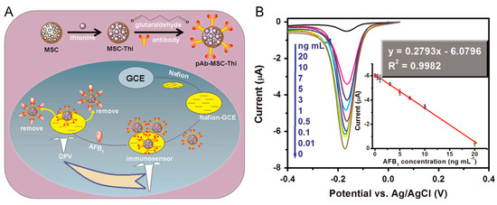 | Aflatoxin B1 | MCNs | Thionine | AFB1 antibody | GCE/OMC-Thi/GluA/AFB1 + BSA | 10–2 × 104 ng∙L−1 | 3 ng∙L−1 | 20 days (100%) 50 days (92%) | [247] |