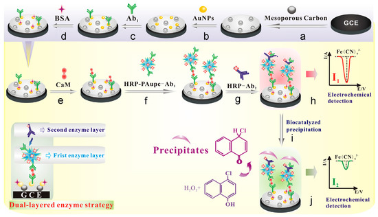 | Calmodulin (CaM) | HMPC | PAupc | Ab1 antibody + HRP | GCE/(OMC-chitosan)/Ab1 + BSA + HRP-PAupc-Ab1 | 5–105 ng∙L−1 | 1.5 ng∙L−1 | - | [250] |