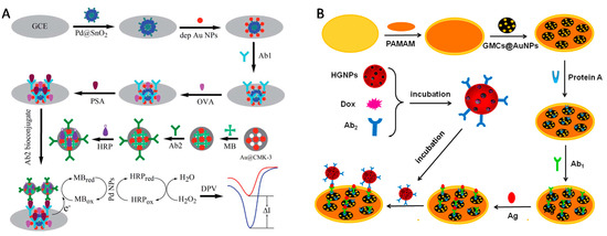 | Prostate-specific antigen | CMK-3 (SBA-15/sucrose) | Pd-SnO2 & Au NPs | Ab1 & Ab2 antigens, HRP | GCE/(Pd-SnO2-Au NPs + Ab1) + OMC/Au NPs-MB-Ab2-HRP | 0.01–100 µg∙L−1 | 3 ng∙L−1 | 15 days (96%) 30 days (89%) | [256] |