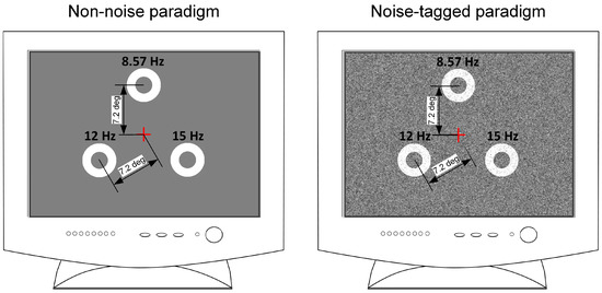 In this study, three motion-reversal targets were simultaneously presented to participants through a gamma-corrected 22-inch Dell LCD monitor at a resolution of 1024 × 768 pixels. Each participant was situated 70 cm from the screen with the center at eye level. Three targets were uniformly arranged in an equilateral triangle. The eccentricity from the center of the monitor to that of each target was in a visual angle of 7.2°. Each target was created using a motion ring object whose width was kept constant as half the radius of the circular region (Michelson contrast of 98.8%) throughout the motion reversal procedure. The circular area was 4.8° in diameter, in accordance with previous studies showing that a stimulus size beyond 3.8° would saturate VEP responses [42]. The phase of the motion ring was temporally sinusoidally shifted so as to produce the motion reversal procedure, which included the inward contraction and outward expansion motions alternately. Here the contraction of the motion ring was implemented by its phase shift from 0 to π, and then expansion motion was achieved with phase shift from π back to 0. The three targets moved at unique, constant, and mutually-irrational stimulation frequencies. In accordance with the integer division of the 60-Hz refresh rate, motion-reversal frequencies of 15 Hz, 12 Hz, and 8.57 Hz were assigned to the lower right, lower left, and upper targets, respectively. With the same paradigm, but adding a moderate visual noise, a noise-masked visual stimulation was applied as illustrated in Figure 1. In the present study, the spatiotemporal noise referred to as dynamic changes of spatial noise speckles. Each noise speckle subtended a square area of 5 min of visual angle and obeyed Gaussian intensity distributions with a mean gray level of 128 and a standard deviation of 40. The spatiotemporal noise was masked to targets and was updated in 1/60 s. The stimulation design and the motion reversal procedure were scheduled according to our earlier studies [37,43]. Presentation of the stimulation was controlled by the Psychophysics Toolbox (http://psychtoolbox.org/) [44,45].