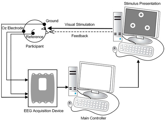 EEG signals were recorded from the occipital head (Oz) using a g.USBamp system (g.tec Medical Engineering GmbH, Schiedlberg, Austria) at a sampling rate of 1200 Hz in order to ensure that trials encompassed single cycles of three stimulation frequencies exactly. This allowed each stimulation frequency to be fully contained within an individual FFT “bin”, thus alleviating spectral leakage [39,40]. EEG signals were referenced to a unilateral earlobe and grounded at the forehead (Fpz). An online band-pass filter from 2 to 100 Hz and a notch filter between 48–52 Hz were applied to remove artifacts and power line interference.