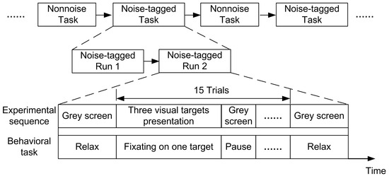 The overall BCI system diagram was illustrated in Figure 2. The online BCI tasks were categorized into non-noise and noise-tagged tasks. Participants were asked to attend to every 15 Hz, 12 Hz, and 8.57 Hz stimulation sequentially, which constitutes a stimulation sequence. For each participant, each task contained 4–8 runs and each run consisted of five stimulation sequences with 15 trials. The experimental tasks alternated every two runs like “Non-noise run – Non-noise run – Noise-tagged run – Noise-tagged run – Non-noise run – Non-noise run …”, as illustrated in Figure 3. The online BCI tasks were implemented in a semi-synchronous way wherein the duration of stimulation varied from 2 to 10 s in steps of 0.5 s, with a fixed 5 s inter-trial interval (ITI). In every trial, a one-second red cue displayed above a specific target and instructed participants to pay attention to that target. The duration of stimulation increased until the target was identified twice as being the same target in succession (either correct or not). Once the target was identified, a one-second green cue appeared in the center of the screen to mark the result and this trial ended. If brain responses failed to meet the detection criteria beyond 10 s for any of the three targets, this trial would end with no cue. Resting spontaneous EEGs were collected at ITIs. Participants were not allowed to blink eyes or move their bodies during each run and they were asked to fixate on the center of screen during the ITI periods. Therefore, the horizontal or vertical electrooculogram (EOG) signals were not recorded and trials contaminated by few artifacts were also not excluded.
