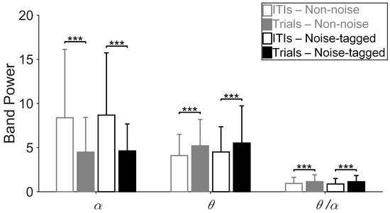 Comparison of mental load indices between non-task ITIs and on-task trials in both non-noise and noise-tagged conditions across participants. The mean values and standard deviation (SD) of α and θ powers and the θ/α ratio were calculated across twelve participants. All statistics were assessed by one-way ANOVA, *** p < 0.001 between non-task ITIs and on-task trials in both non-noise and noise-tagged BCI applications.