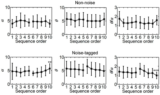 Specifically, for the second runs (i.e., sequence order 6–10; Figure 5) of the non-noise BCI task, a trend representing the increase in mental load as the decrease in α power and the increase in θ power, and in the θ/α ratio, seemed to be present among the successive sequences, but did not reach statistical significance (F(4, 95) = 0.66, p = 0.618 for α power; F(4, 95) = 0.34, p = 0.848 for θ power; F(4, 95) = 1.47, p = 0.217 for θ/α ratio; one-way ANOVA with Bonferroni-corrected post-hoc tests). For the second runs of the noise-tagged task, the reversed phenomena of an overall rise tendency of α power could be noticed across successive sequences (ANOVA testing for linear trend: p < 0.001), whereas θ power and θ/α ratio decreased progressively with increasing sequence order (p = 0.025 for θ power; p < 0.001 for θ/α ratio). The sequence differences in α power and in θ/α ratio were also significant (F(4, 95) = 3.57, p = 0.009 for α power; F(4, 95) = 5.68, p < 0.001 for θ/α ratio; one-way ANOVA with Bonferroni-corrected post-hoc tests), whereas the difference in θ power was not significant (F(4, 95) = 1.47, p = 0.216). These demonstrated a facilitation of visual noise in alleviating the mental load, as indicated by the increase in α power and the decrease in θ power and in θ/α ratio. Additionally, the mental load was worsened in the normal non-noise BCI task.