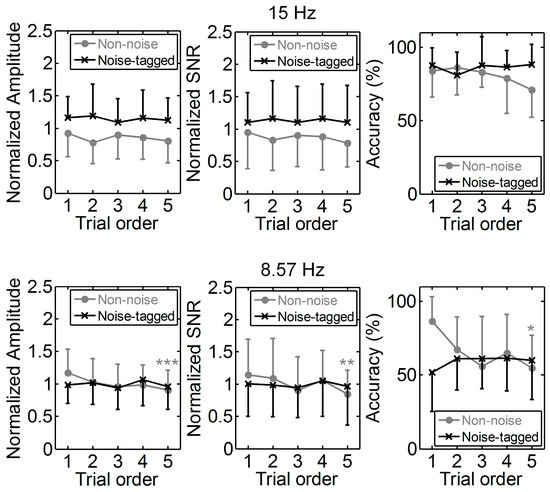 Figure 6 indicates the amplitude, SNR, and accuracy differences between different trial orders for both non-noise and non-tagged tasks at different stimulation frequencies across twelve participants. The SSMVEP amplitudes and SNRs at stimulation frequencies of 15 Hz and 8.57 Hz, and their respective sub-harmonics, were extracted from the spectral power of multiple runs of successive trials with the same order. Inter-participant normalization was attained by dividing the amplitude and SNR estimates by the average computed from all amplitude and SNR values of both non-noise and noise-tagged conditions, respectively, but separately for each participant [52]. Three-way repeated ANOVA with Bonferroni correction, which included the factors of “noise mode”, “stimulation frequency”, and “on-task trial”, showed a significant interaction effect between the noise mode and the on-task trial in SSMVEP amplitude and accuracy (p = 0.039 for amplitude; p > 0.023 for accuracy), implying that the tendencies of SSMVEP amplitude and accuracy over five consecutive on-task trials changed with the noise mode. Here the overall decreased tendencies of SSMVEP amplitude and accuracy in non-noise tasks and their stable tendencies in noise-tagged tasks could be noticed across consecutive on-task trials in Figure 6.