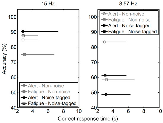 To support the above-mentioned accuracy results in Figure 6, more sophisticated statistical analysis with correct response time, which characterized BCI efficiency, were assessed under different noise strengths, as illustrated in Figure 7. The differences in correct response time upon a certain online accuracy value for both alert and fatigue states were analyzed in the non-noise and noise-tagged BCI tasks across twelve participants. This accuracy value was calculated as the grand-averaged percentage of correctly judged trials, and the correct response time at stimulation frequencies of 15 Hz and 8.57 Hz in the first and last single trials of all experimental runs was extracted to represent the alert and fatigue states, respectively.