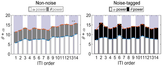 Stacked histograms showing the comparison of different fatigue indices (i.e., α, θ, and θ + α powers) between 14 consecutive non-task ITIs in both non-noise and noise-tagged conditions across participants. The grand-averaged mean values and SD of α, θ, and θ + α powers were calculated from 14 consecutive non-task ITIs of the same order in each run across twelve participants. The polyline in blue represented the time course of the grand-averaged α power along with the 14 ITIs within five stimulation sequences of multiple runs. The polyline in magenta represented the time course of the grand-averaged θ + α power. All statistics were assessed by one-way ANOVA, ** p < 0.01 between 14 consecutive ITIs.