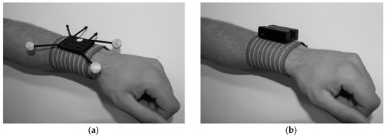 The reproducibility factor in a MoCap system is conditioned by the attachment of the markers or sensors to the body [20]. If the union is not constant, stable, and rigid, the measurement quality may worsen through the existence of relative movements between the devices and body [25,26,27]. Various authors have referred to errors derived for this reason in their research [6,8,11,28]. Although some authors consider the position of the IMUs in the body [29,30], positioning continues to be performed only by a visual check, by trying to align sensor axes with the segment [27,28,31]. Despite being decisive, union elements between the electronic device (IMU) and the body are usually one of the last issues considered in the design, when this should be a matter considered during product design.