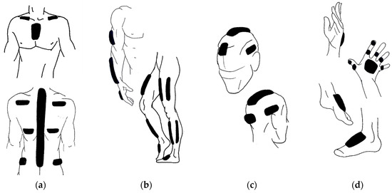 In Figure 5a, areas of chest placement are seen. In this multi-segment zone, we can opt for different positioning alternatives: sternum, spine, hips, ribs, shoulder blades, or clavicles. Most systems place one sensor on the sacrum and another on a higher area of the torso, either the anterior or posterior part. To homogenise the stem analysis, Yu et al. [31] studied the movements of the vertebral column to determine the optimal placement of the sensor placed in the upper part. The results showed that the most representative points to monitor displacement of the medial or lateral trunk were the T7-T8 vertebrae. In these parts, the smallest error occurs (0.5°). However, using more sensors in this area may be beneficial, so some systems place a sensor in the mid-spine zone to improve the approximation of its curvature [32], others also add sensors on the sides (clavicles, shoulder blades, or ribs), which allow monitoring the movements of the shoulders and/or the asymmetrical twists of the body [33,39,45,46,52,56].
