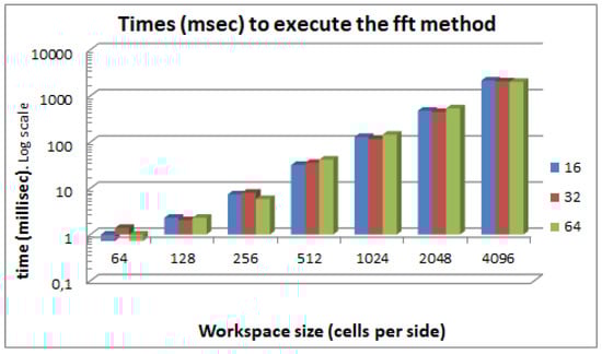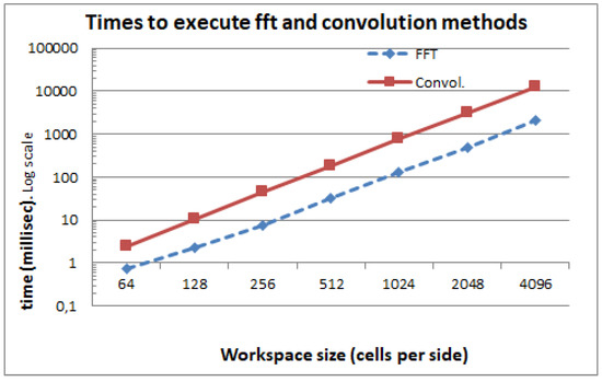Comparison of the convolution and FFT execution times for a robot of 16 × 16 cells and varying workspace sizes.