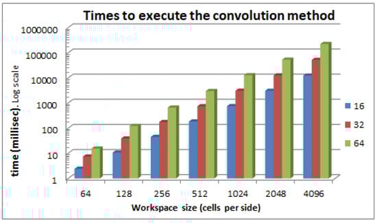 Convolution method execution times for different robot and workspace sizes. The robot and workspace are square and the size is the number of cells on each side.