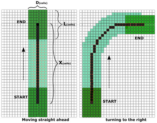 Cells covered by the robot while moving. On the figure on the left, the robot moves straight ahead. On the figure on the right, the robot turns to the right.
